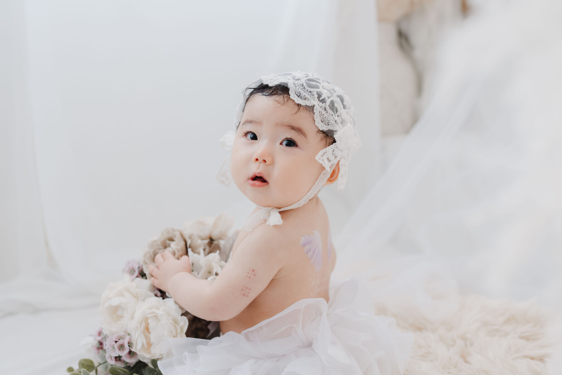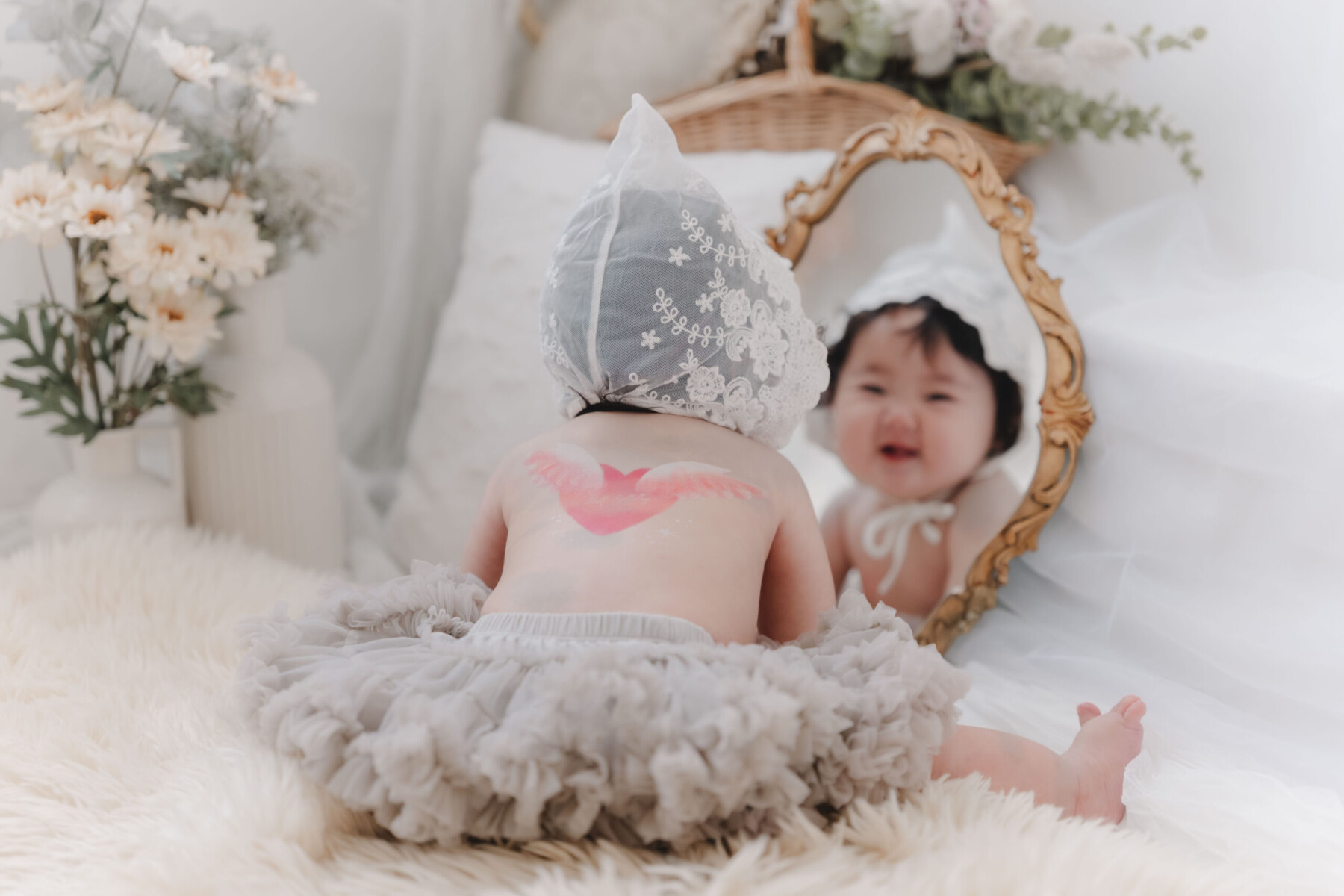 乳児に使用できるペイントでお子様の背中に可愛い天使の羽のペイントをします。