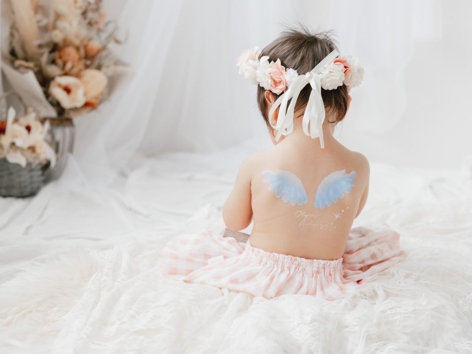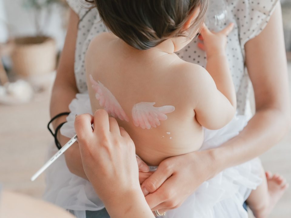 乳児に使用できるペイントでお子様の背中に可愛い天使の羽のペイントをします。