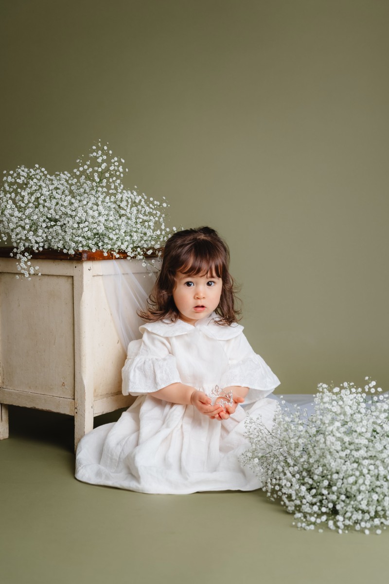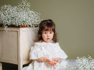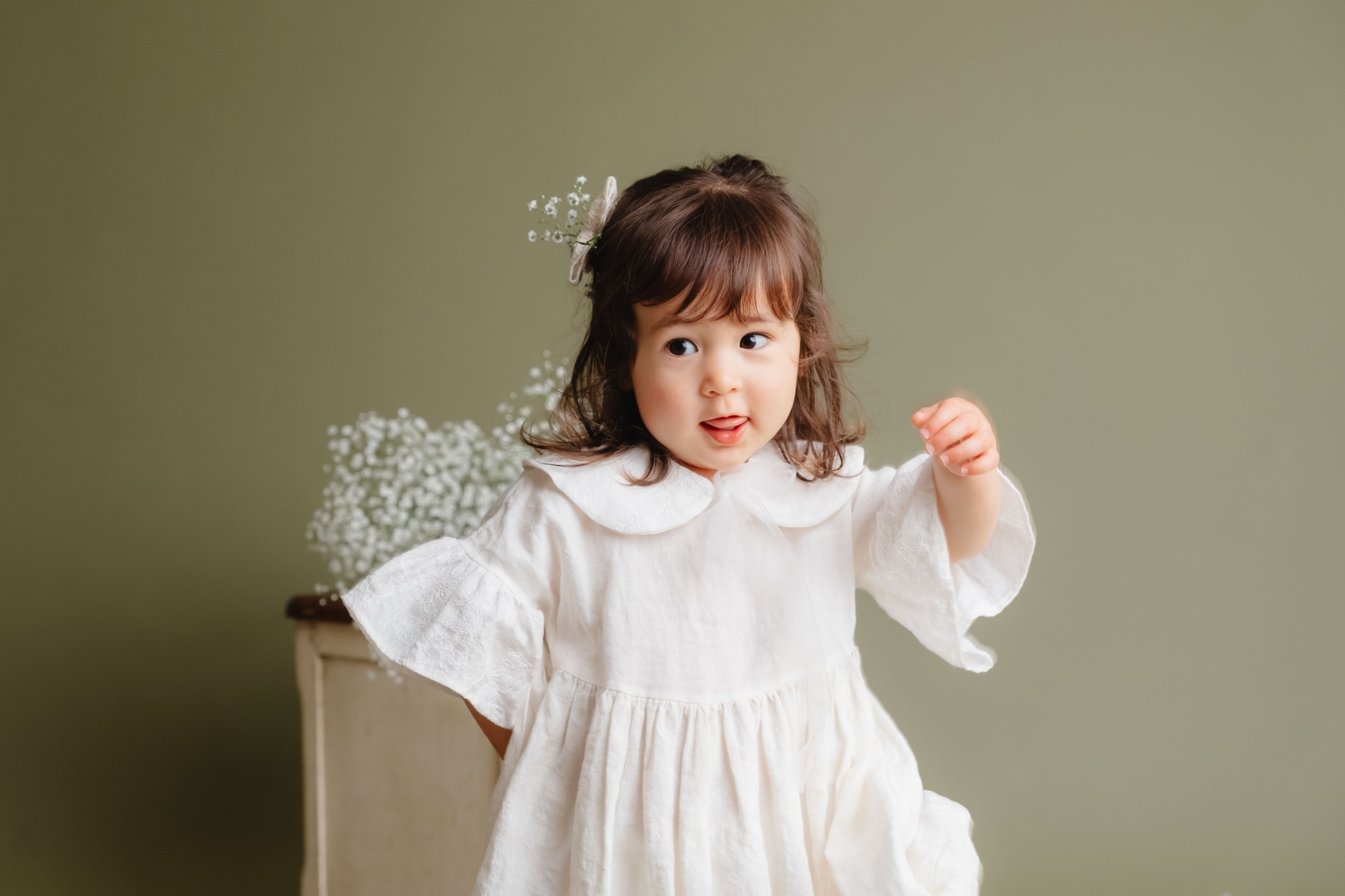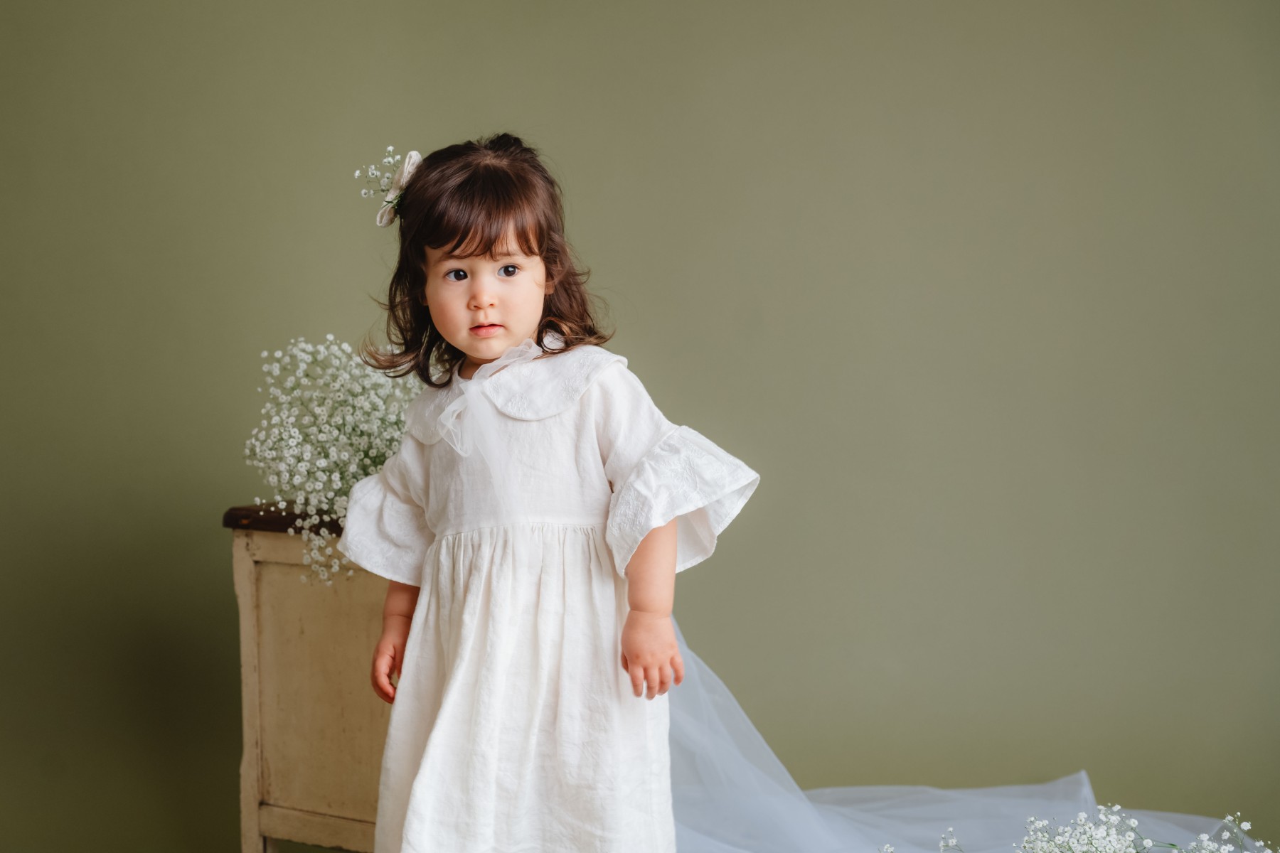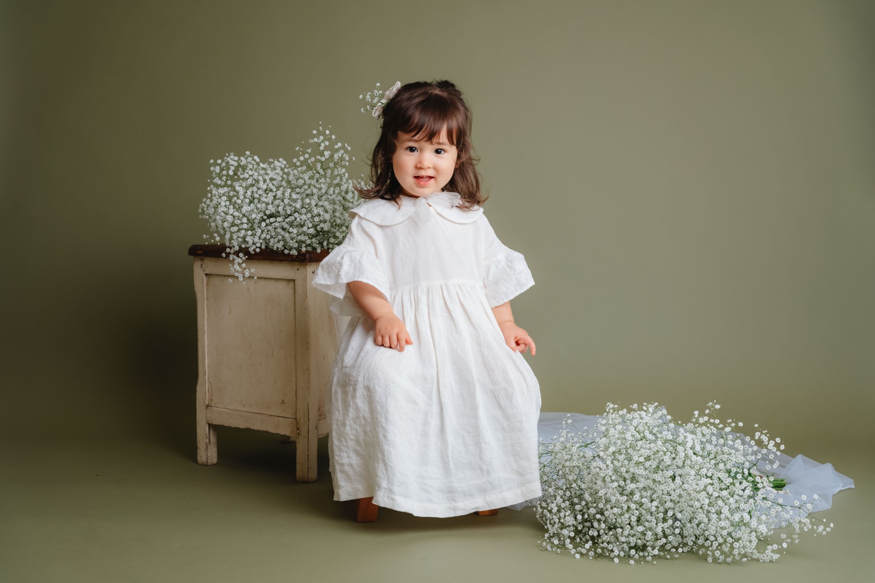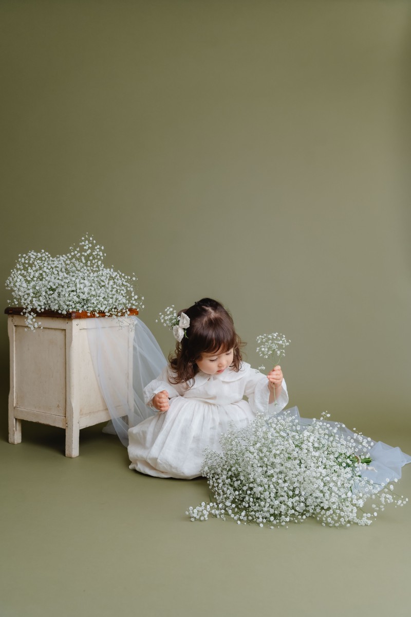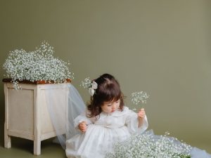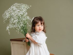 オリーブ色のオシャレな背景にかすみ草の生花を入れてライトを使っての本格撮影となります。