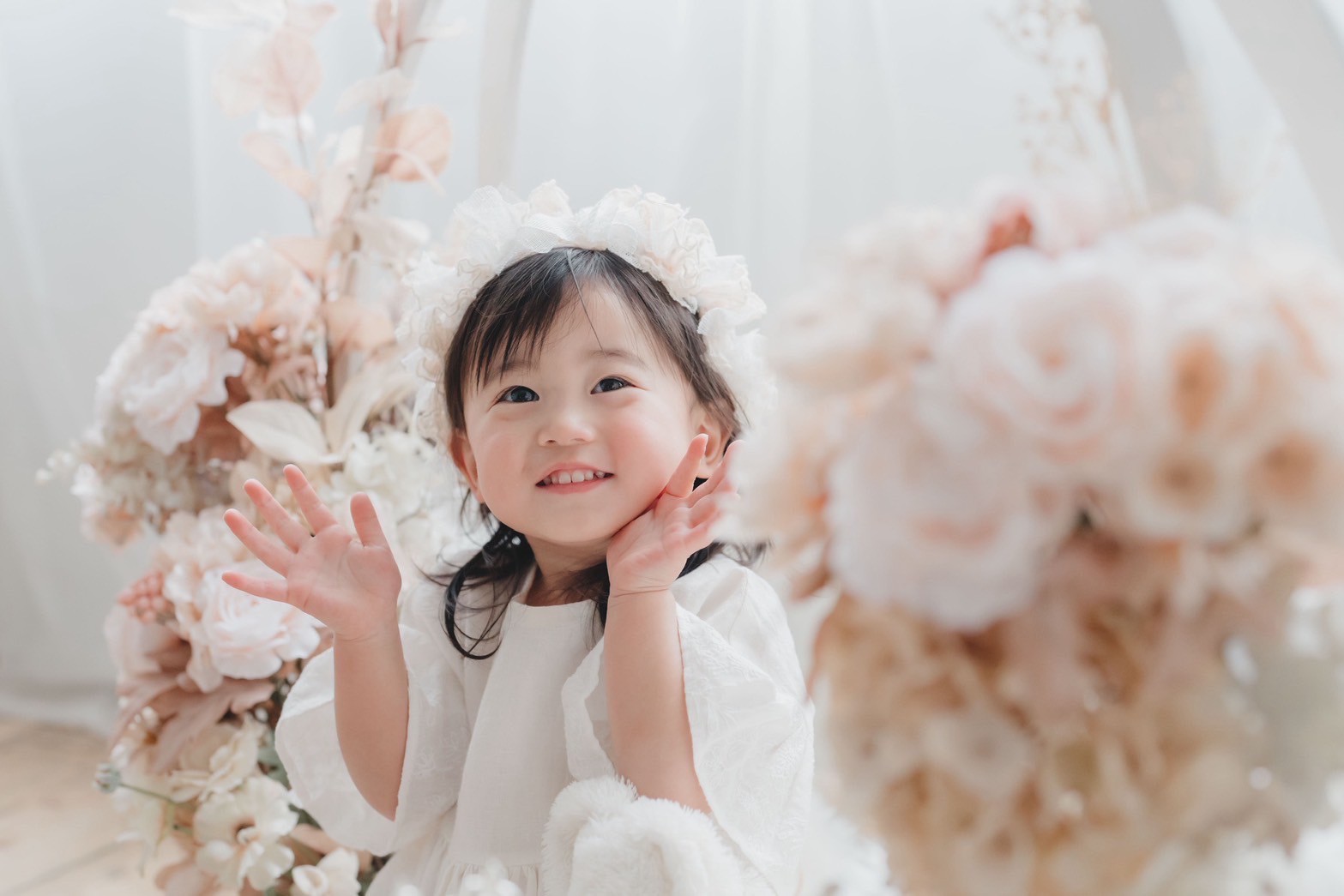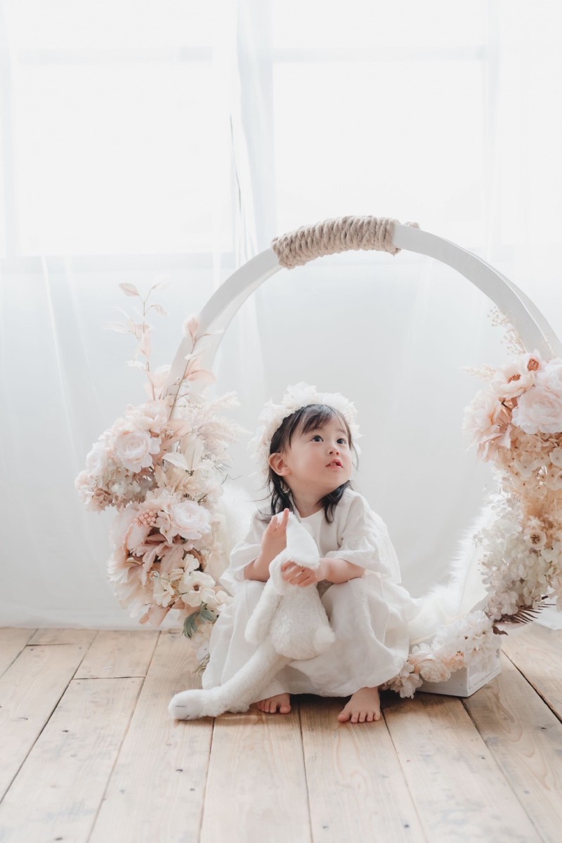 あたたかい木のぬくもりを感じる床、フラワークレイドル(白いゆりかご)を使った、透明感のあるやわらかな写真を残しています。